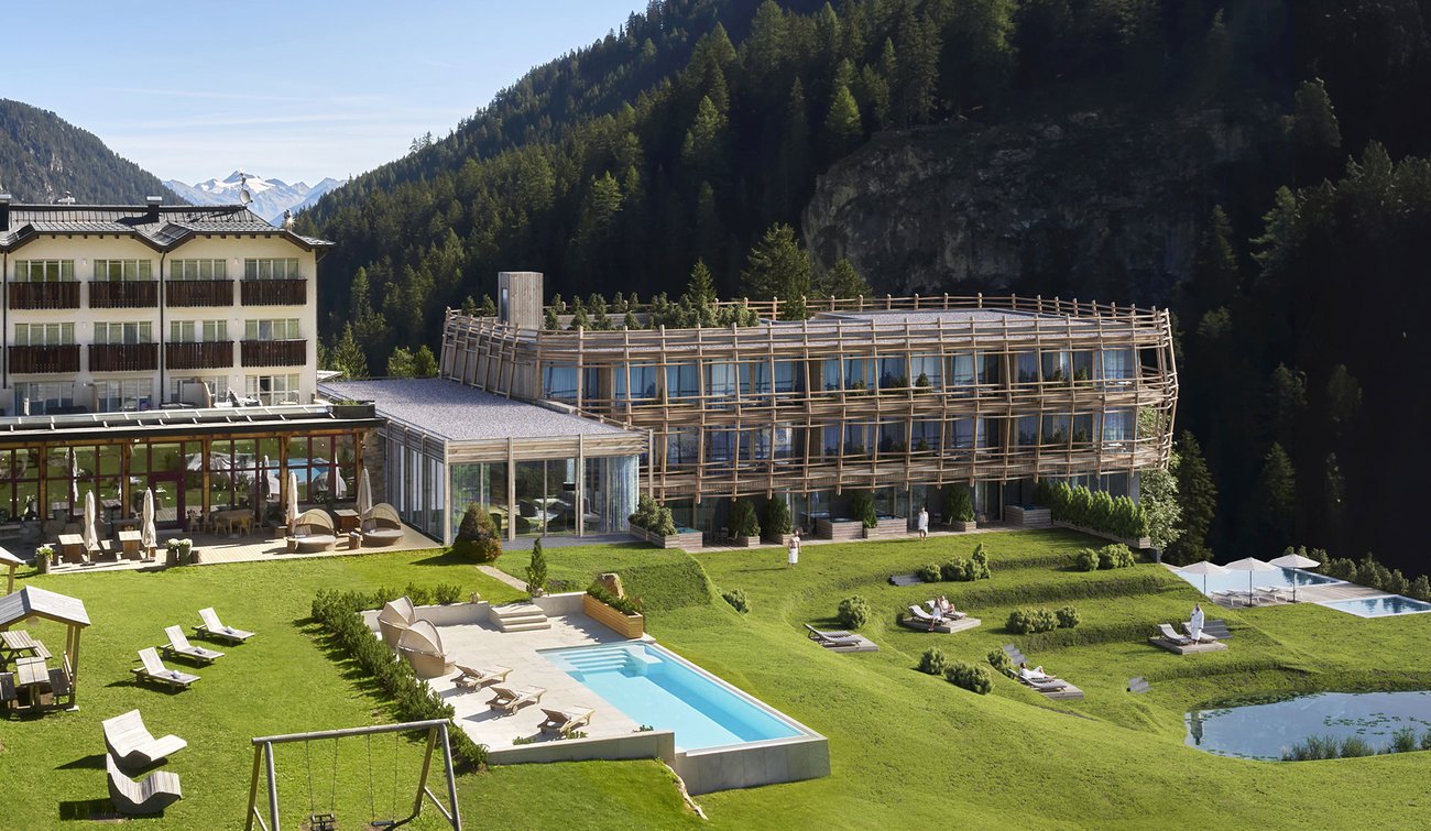 Introducing a fresh approach to hospitality that respects nature and local traditions, the new extension to this family hotel is reminiscent of a nest, with an airy wooden lattice facade.