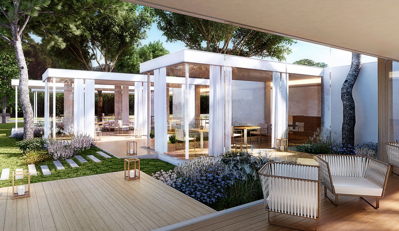 Eine zeitgemäße Interpretation des Familienbungalows, bestimmt durch den Genius Loci. Pinienbäume definieren den Grundriss der „botanischen Architektur“, in dem sich 32 „Patio-Häuser“ mit eigenen Gärten in die umliegende Natur einfügen, mit ihr verschmelzen.